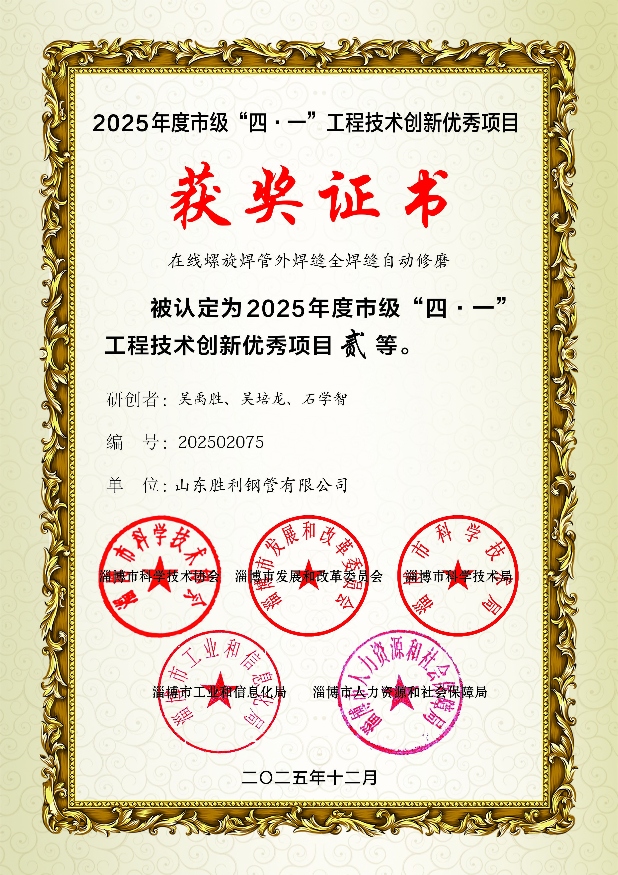 近日,山东胜利的“在线螺旋焊管外焊缝全焊缝自动修磨”项目荣获 2025 年度市级“四 · 一”工程技术创新优秀项目二等奖,此为近年来公司首次获政府部门颁发的科技项目类奖励。
